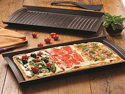 En la zona de cocción los bastones confieren el típico sello del grillado. Todo el conjunto se caracteriza por una curvatura transversal que permite a los jugos de cocción desplazarse hacia las canaletas laterales logrando grillados más sanos.