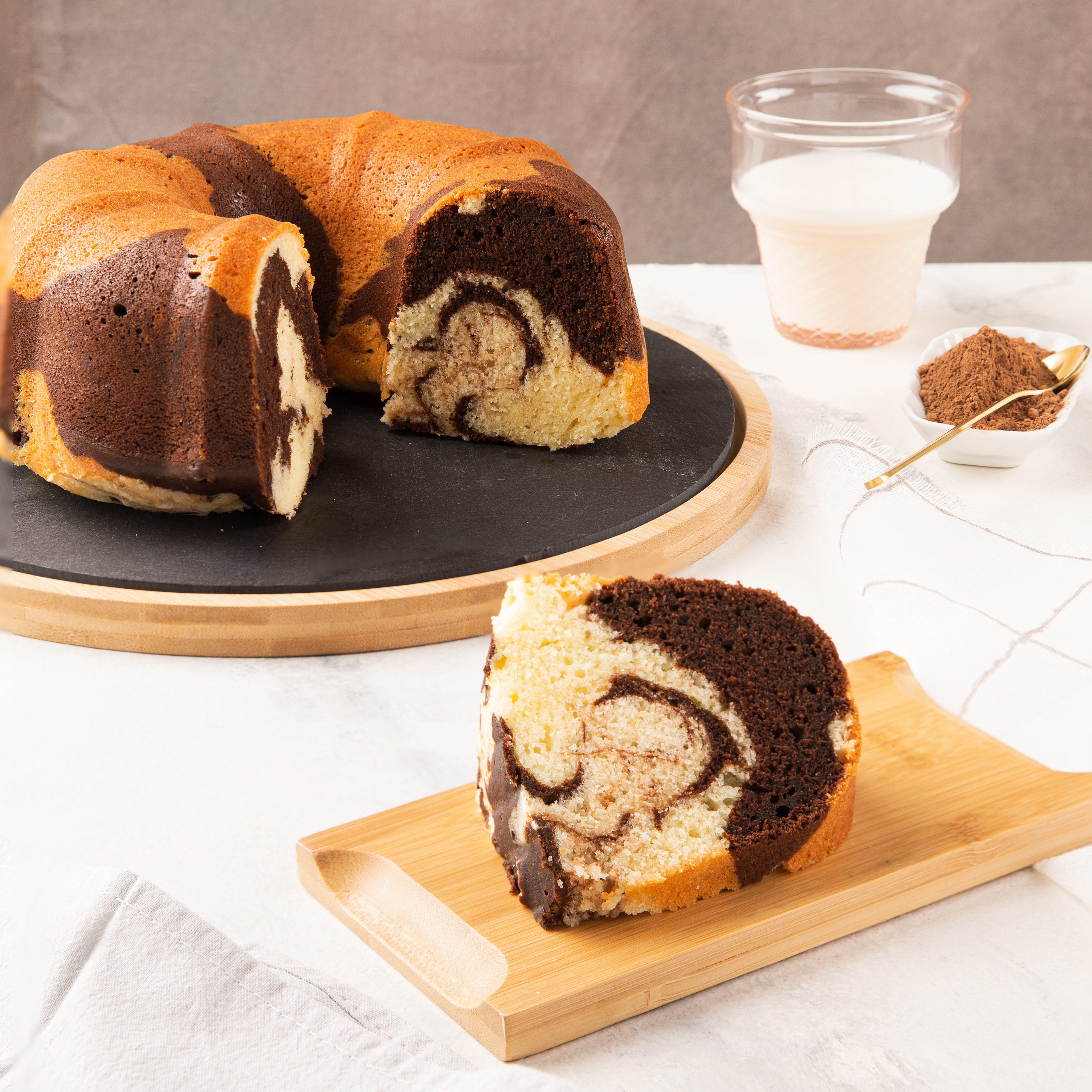 • Volcamos la preparación con vainilla en el Savarín enmantecado intercalando con la mezcla de cacao.