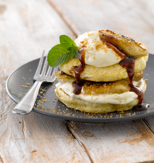 Formamos una torre con los blinis y las bananas. Decoramos con cascaritas de limón y canela.
