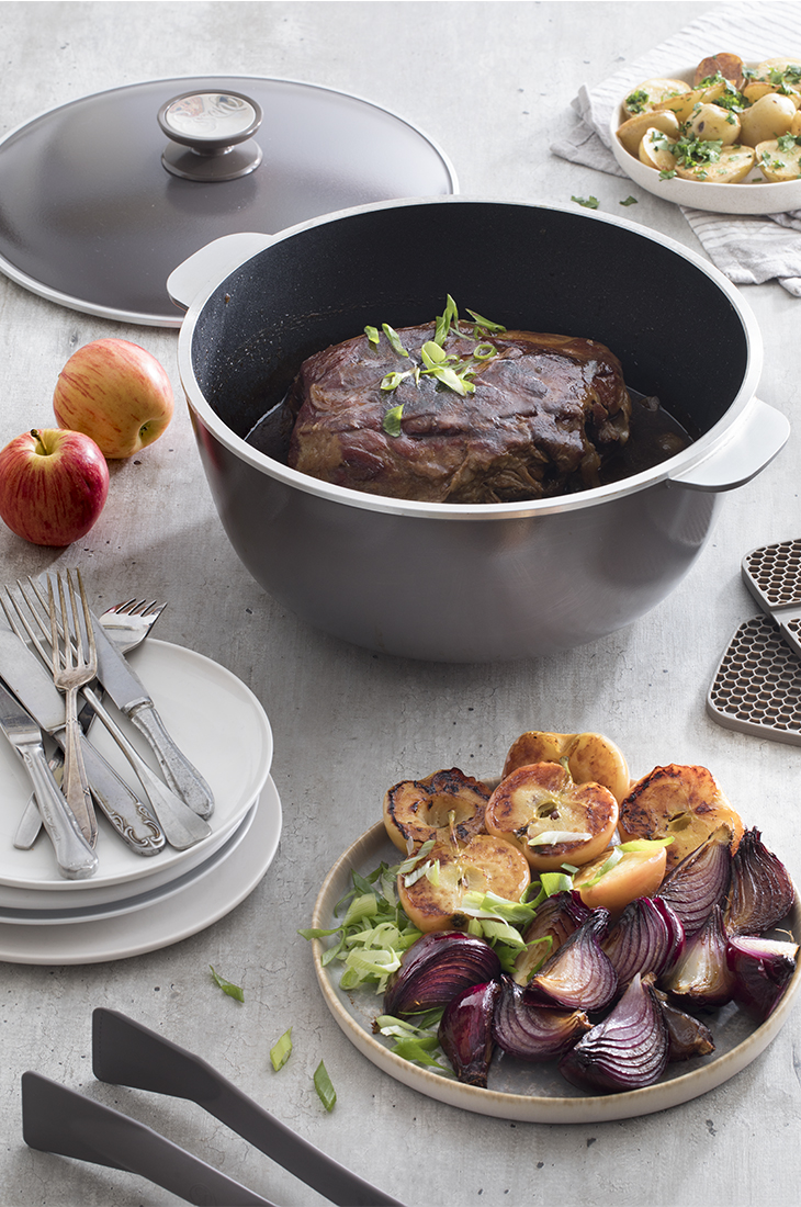 Servir la bondiola junto a las manzanas y las cebollas asadas y los papines!