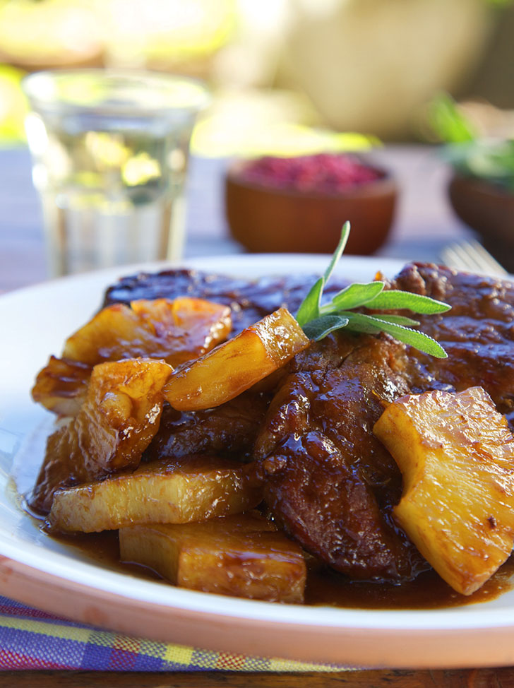 Al finalizar la cocción, añadimos las rodajas de ananá cortadas al medio y la salvia.