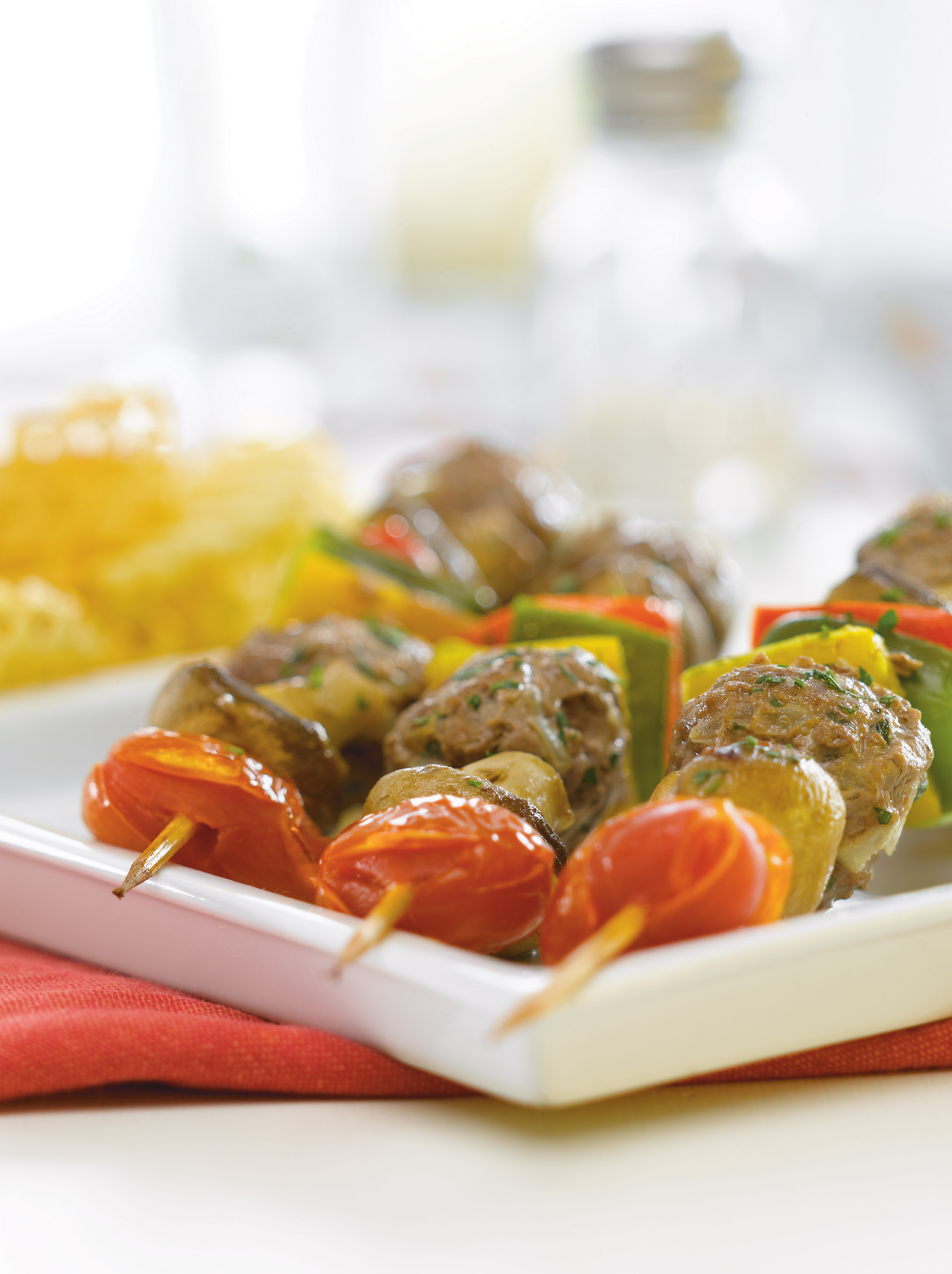Aceitamos los palillos de brochette e insertamos en forma alternada las esferas de carne y las verduras.