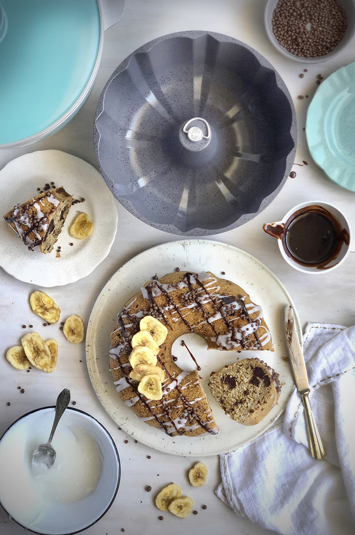 Una vez listo, decorar con un glasé ligero con el azúcar impalpable y el jugo de limón. Unos hilos de salsa de chocolate y unas bananas disecadas.