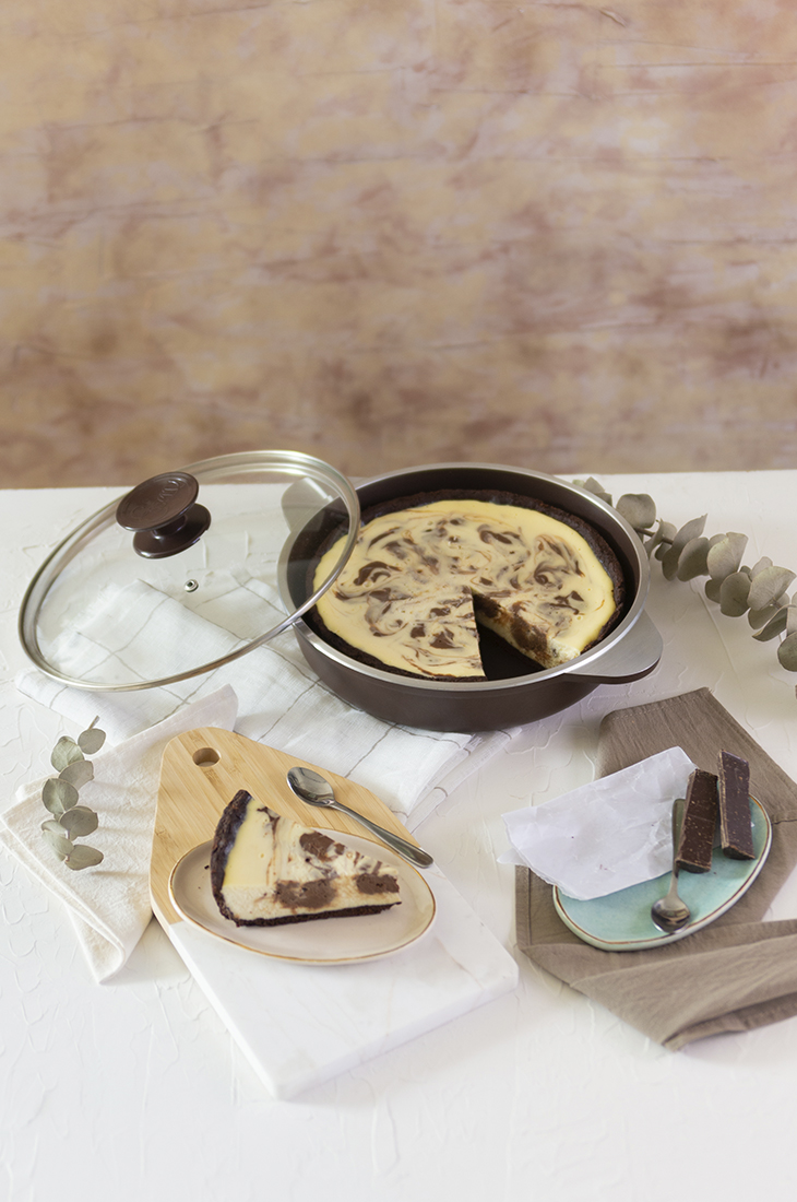 Forramos la Sartén con la masa y volcamos la preparación adentro. Con una espátula vamos agregando por encima la mezcla de chocolate para hacer el marmolado.