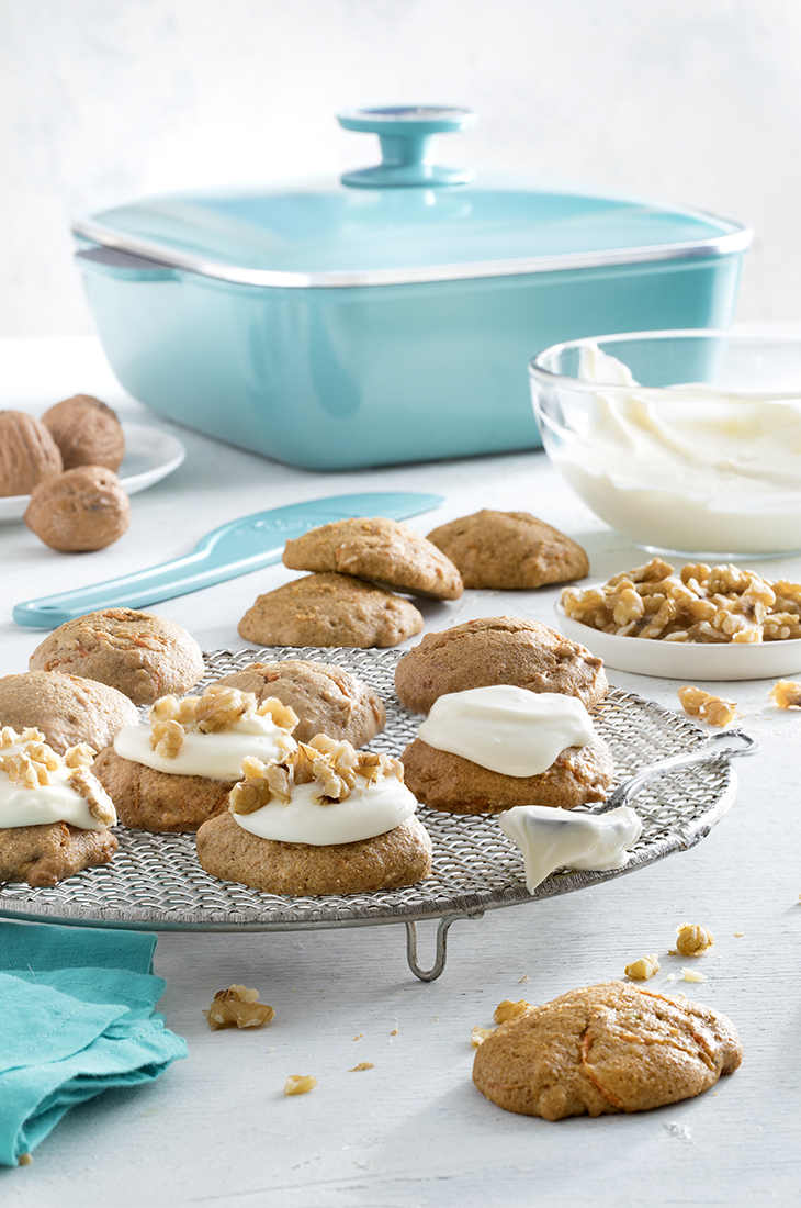 Para el frosting, mezclar el queso crema con el azúcar impalpable y la esencia de vainilla. Llevar al frío para que esté bien consistente y cubrir las cookies antes de servir. Decorar por arriba con unas nueces picadas y disfrutar.