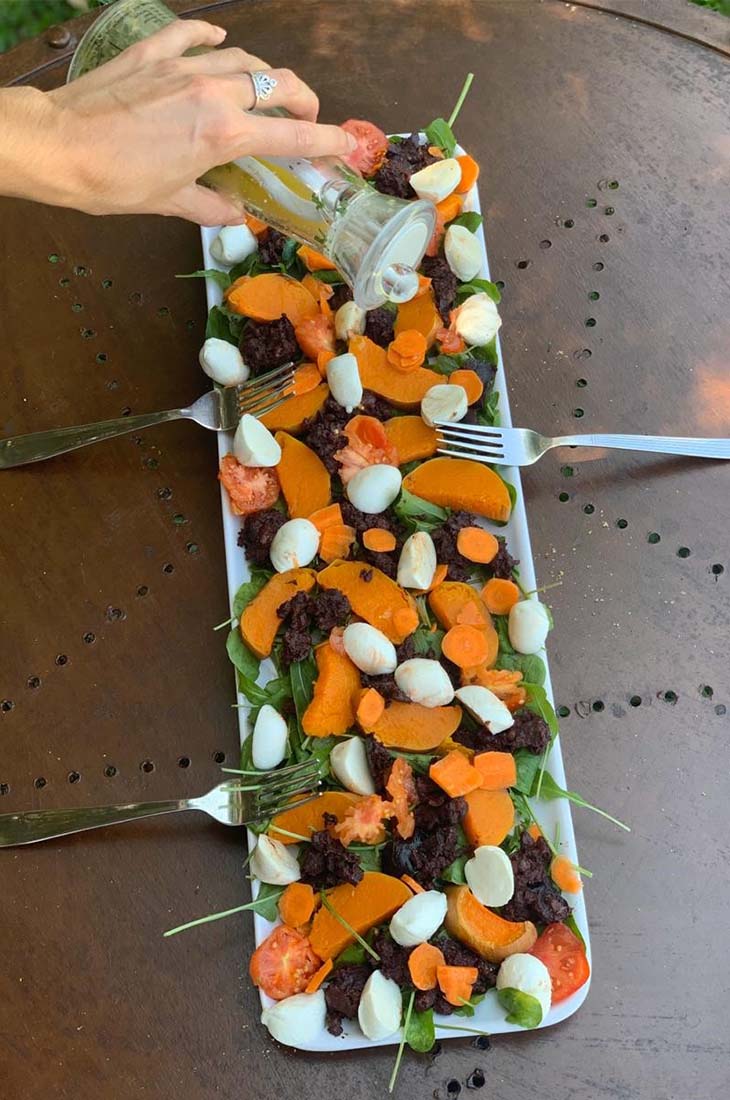 Armar la ensalada con todos los ingredientes y condimentar con la vinagreta.