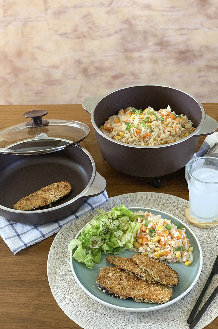 Batimos los huevos con sal, pimienta, mostaza y leche. Pasamos las láminas de berenjena por la mezcla de huevo y luego por el pan rallado. Repetimos la operación.