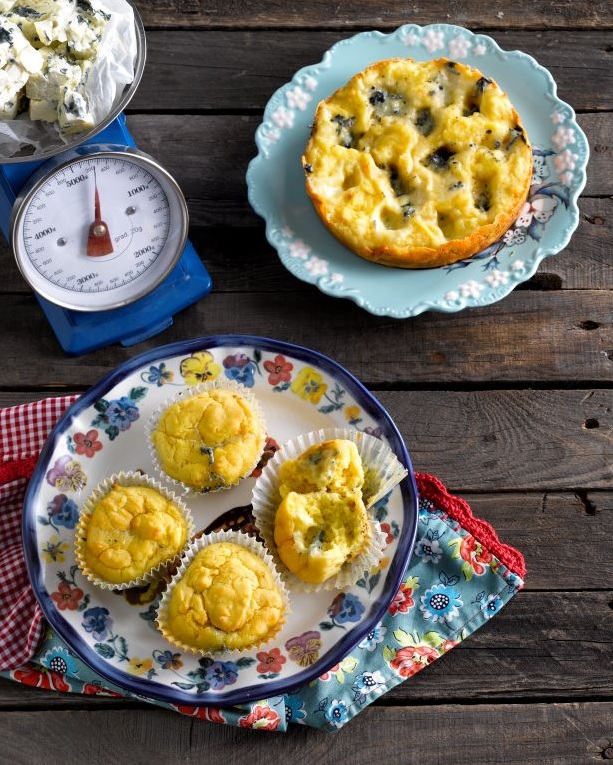 Mezclar todos los secos, agregar la manteca, la leche, los huevos y por último el maíz. Batimos hasta que quede bien integrado, colocamos en pirotines la mitad de la masa, un pedacito de queso azul y por encima un poco más de masa. Rellenamos 3/4 del pirotín.