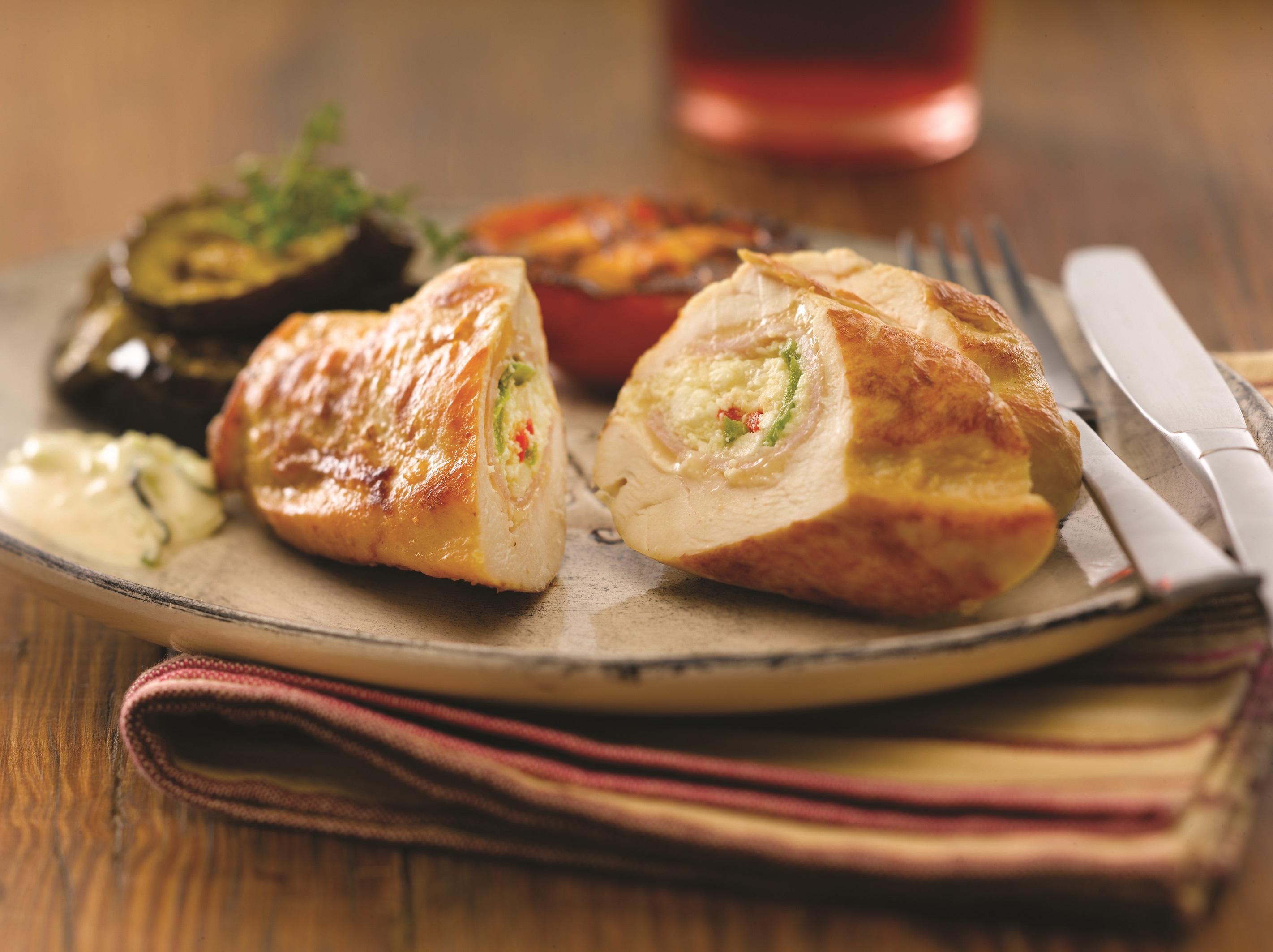 · Abrimos cada pechuga al medio (sin separarla del todo). Sobre cada una colocamos una feta de queso, de lomito y el relleno anterior. Enrollamos y cerramos bien con los palillos.