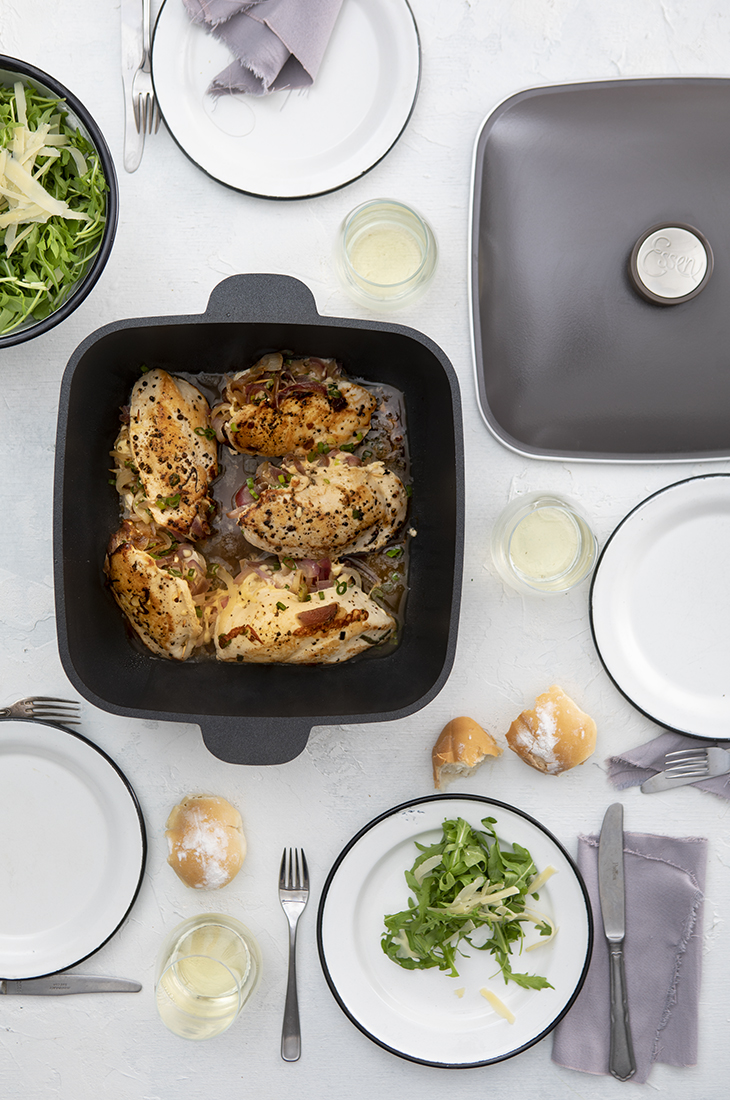 Sellar las pechugas rellenas de ambos lados hasta dorar. Una vez selladas, bajar a fuego mínimo y tapar la Cacerola.