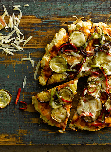 • Cubrimos la masa con la salsa, las verduras salteadas y la mozzarella rallada; tapamos y continuamos a fuego mínimo hasta que se dore bien la base y el queso se funda.