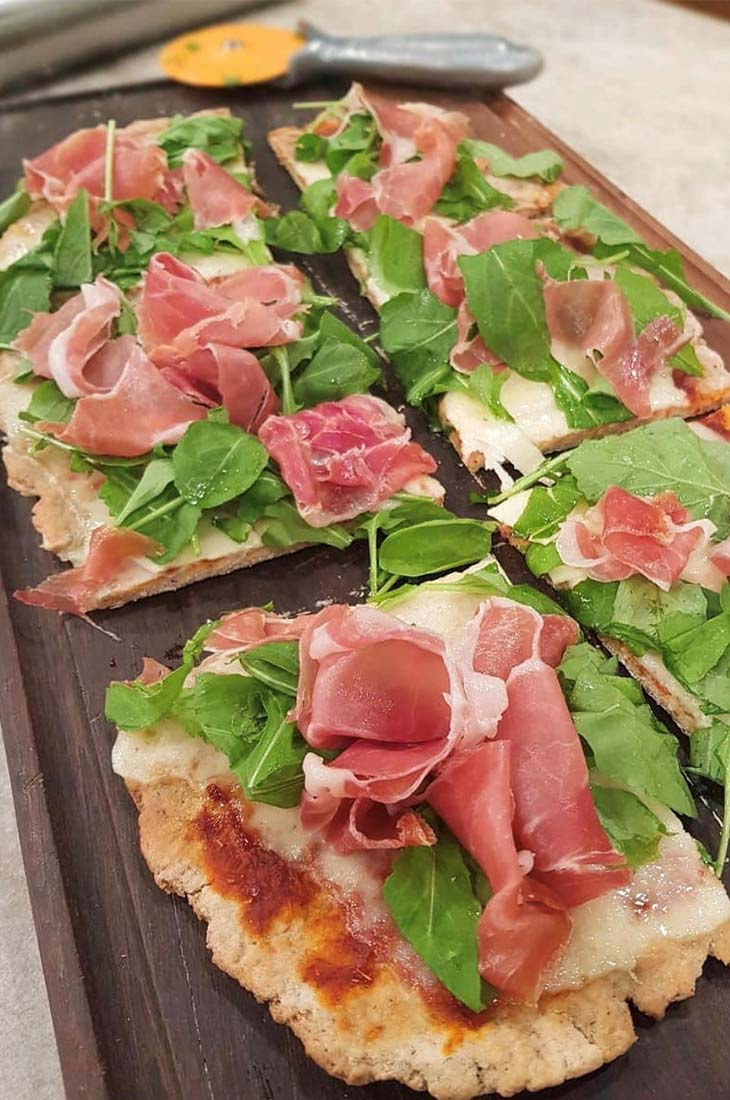 Una vez lista, espolvorear con harina de garbanzos la mesada y estirar con un palote. Una vez que está finita, enrollar sobre el palote y llevar a la bífera bien caliente. Cuando se hacen globitos, girar la masa. Colocar entonces la salsa de tomate, queso y todo lo que le quiera poner en la pizza, en este caso tomates cherry y albahaca.