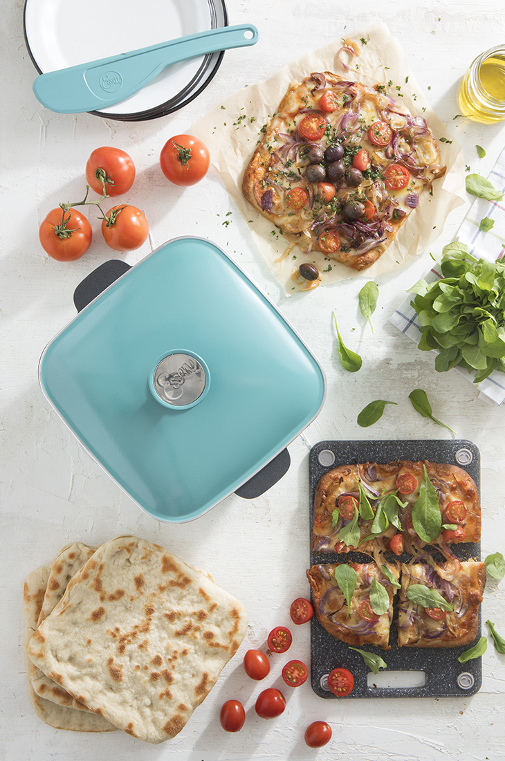 Dividir en bollos y bollar. Dejar descansar unos minutos y estirar dentro de la Cacerola. Llevar a fuego mínimo y dorar de ambos lados. Una vez listas las pre pizzas, dentro de la pieza, agregar la salsa de tomate y agregar el queso mozarella rayado. Dejar que funda y si queremos el queso gratinado colocar del lado del queso unos minutos. Luego, agregar las cebollas salteadas previamente en en el aceite y los tomates cherry cortados al medio. Tapar la Cacerola y dejar cocinar unos minutos más.