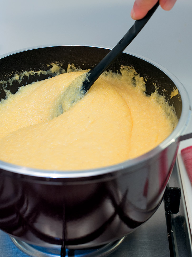 • Colocamos en la Cacerola la harina de maíz junto con el agua y los condimentos (todo en frio).