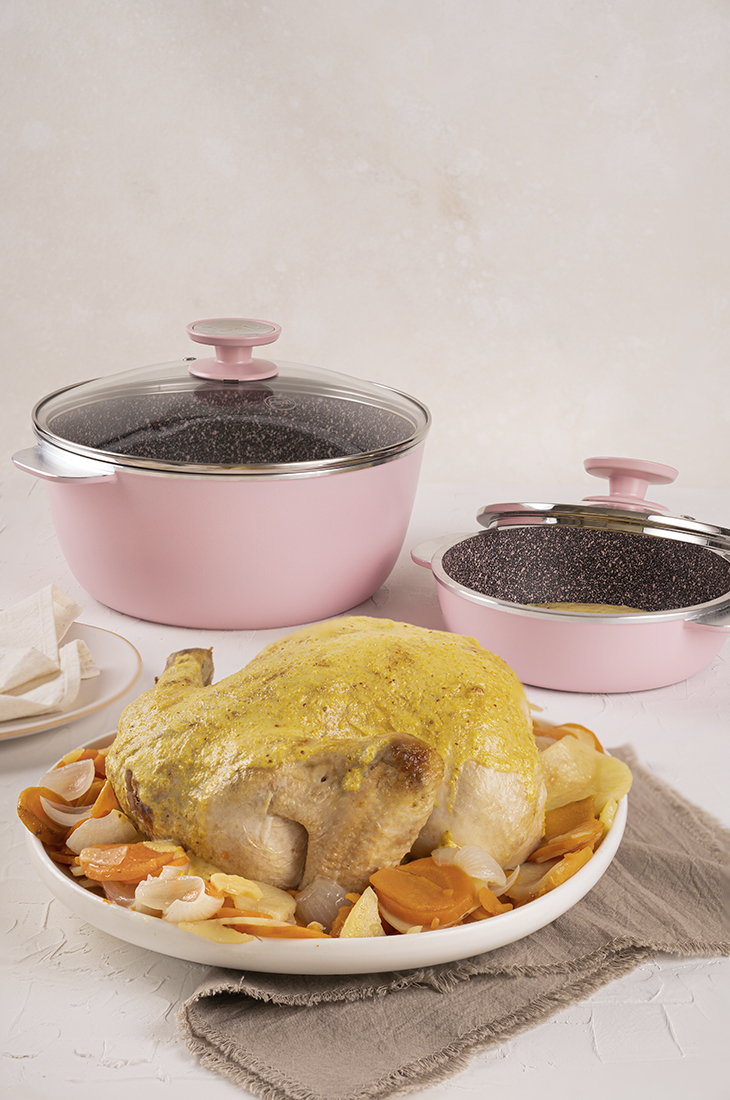 Precalentamos la Cacerola 5’ a fuego máximo, agregamos el aceite y sellamos el pollo 10’ a fuego máximo. Damos vuelta el pollo, bajamos el fuego a mínimo y agregamos las verduras y el ajo y salpimentamos. Cocinamos 30’ a fuego mínimo.