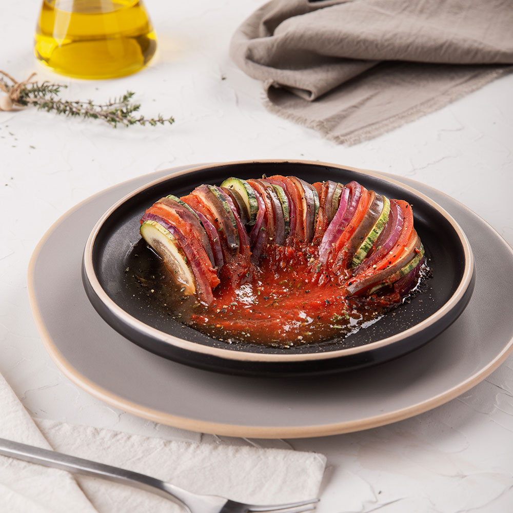 Cortamos todas las verduras en rodajas finas y ubicamos alternadamente del centro a los bordes sobre la salsa.