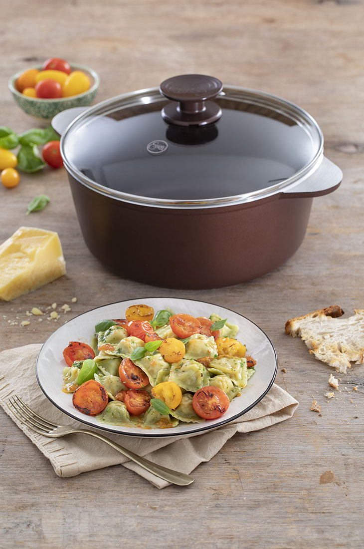 5. Cocción: Colocamos abundante agua en la Cacerola, tapamos y llevamos a Fuego Máximo hasta que rompa el hervor.  Agregamos una cucharadita de sal y los ravioles.  Bajamos a Fuego Mínimo y cocinar entre 5' y 7'.
