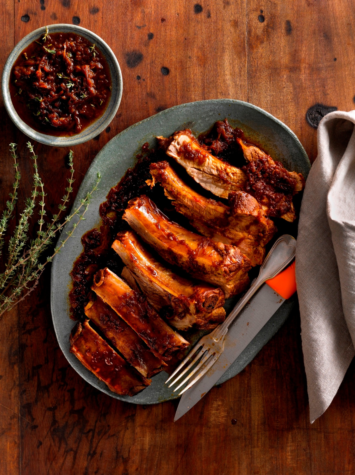 Rociamos con aceite de oliva y colocamos el costillar del lado de la carne; tapamos y doramos a fuego máximo de un lado.