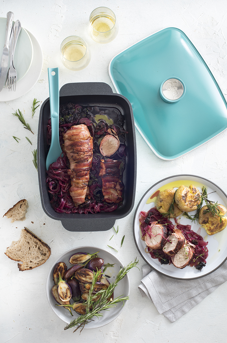 Envolver los solomillos con la panceta en fetas y dejarla bien firme con la ayuda de palillos de madera. Una vez listas, sellarlas en la Fuente con el aceite de oliva hasta dorar. Retirar y reservar.