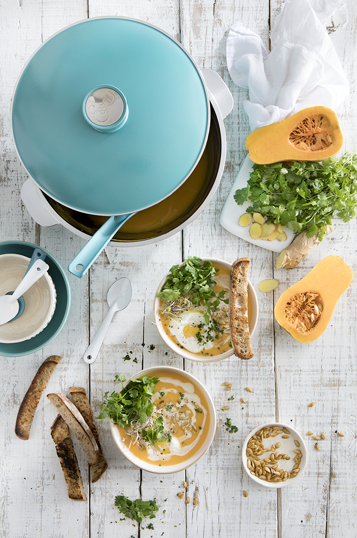 Pasar la preparación a la Cacerola nuevamente y agregar el caldo de verduras, la crema de leche, el jengibre rallado y salpimentar.