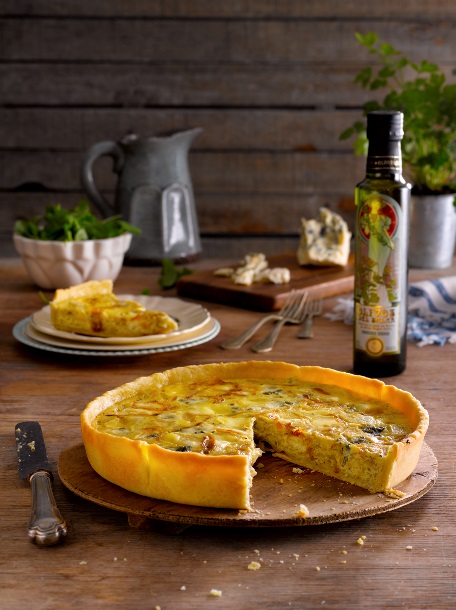 · Colocamos sobre la masa el relleno de cebollas, el queso roquefort y el queso cremoso.