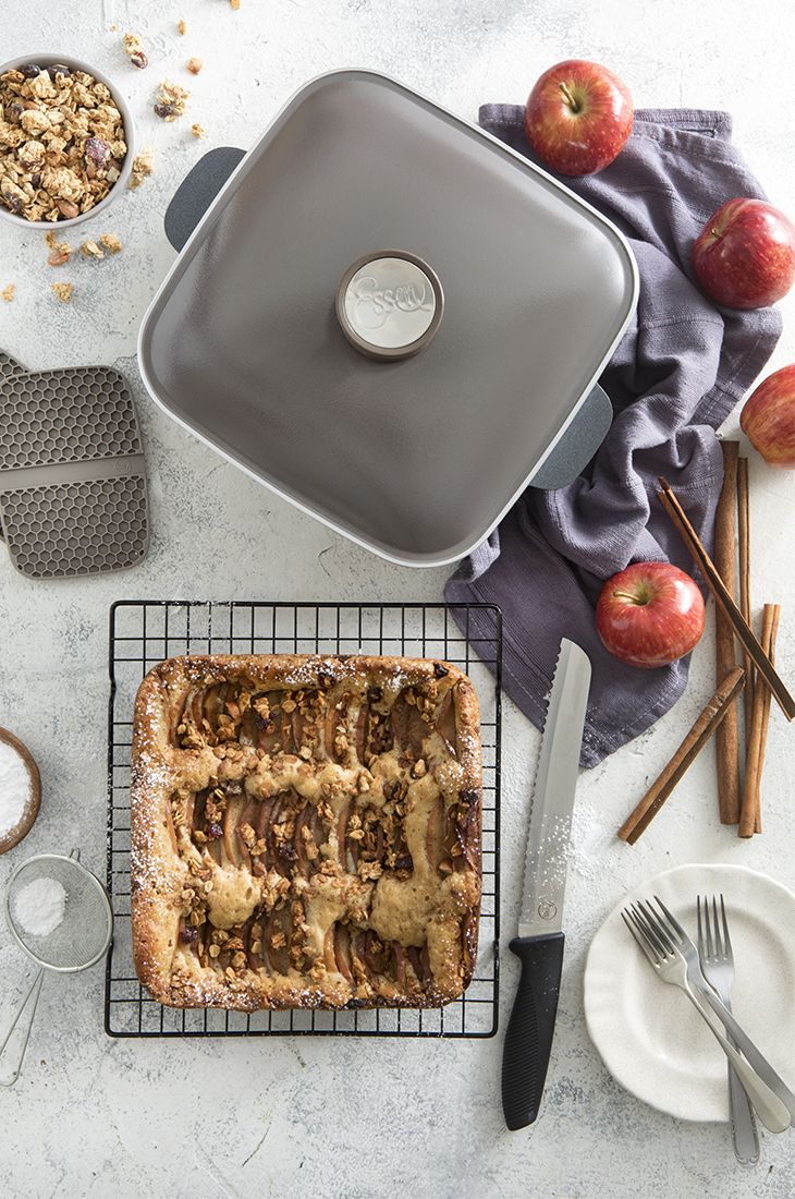 Colocar la mezcla sobre la Cacerola y esparcirla con la ayuda de una espátula. Acomodar por arriba las rodajas de manzanas cortadas bien finitas.