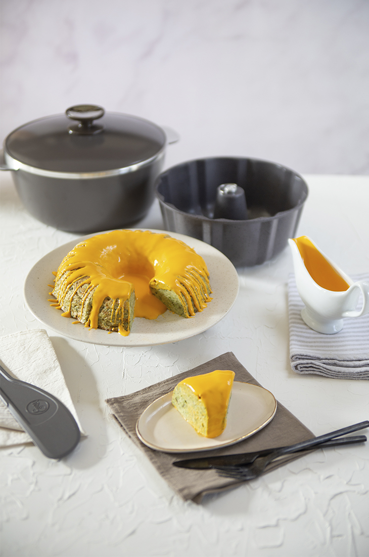 Precalentamos la Cacerola 5’ a fuego mínimo. Colocamos dentro el Savarín con la mezcla y cocinamos a fuego mínimo 40’.