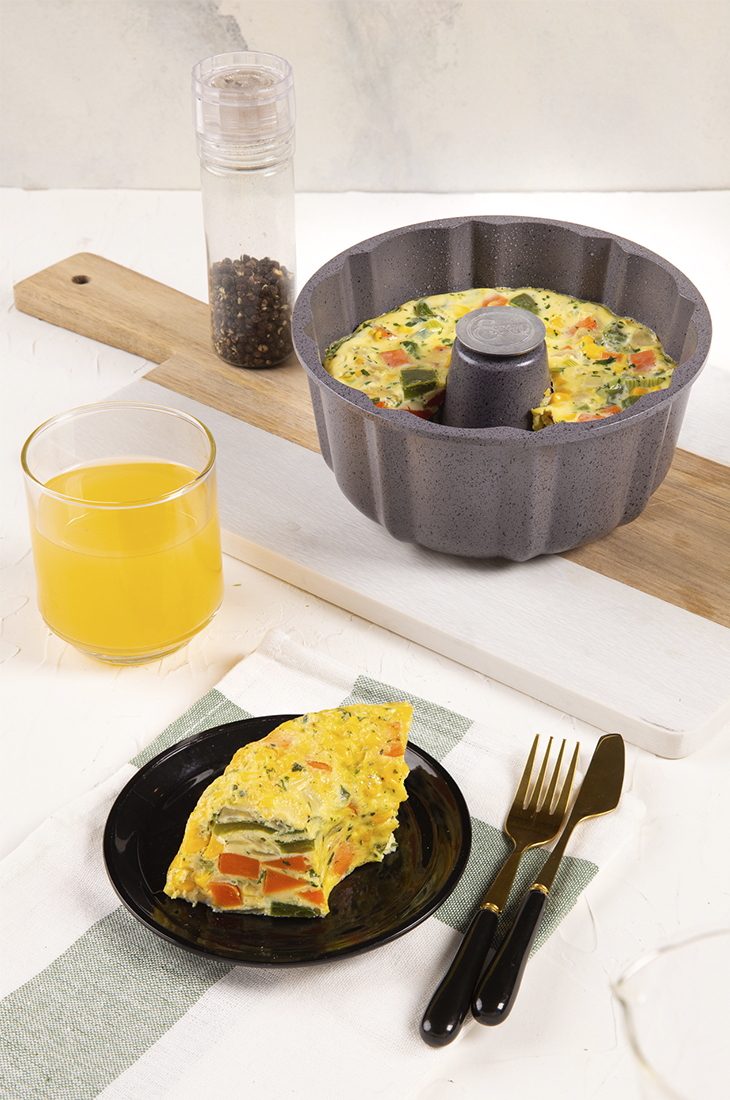 Lubricamos el Savarín con aceite de oliva y volcamos la preparación. Colocamos en la Cacerola y cocinamos 30’ a fuego mínimo.