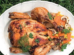 Pollo entero con vegetales y salsa de mostaza